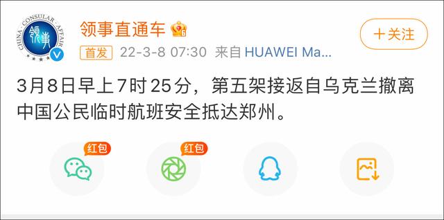 香港中通社3月8日電 3月8日早上7時25分,第五架接返自烏克蘭撤離中國公民臨時航班安全抵達鄭州。