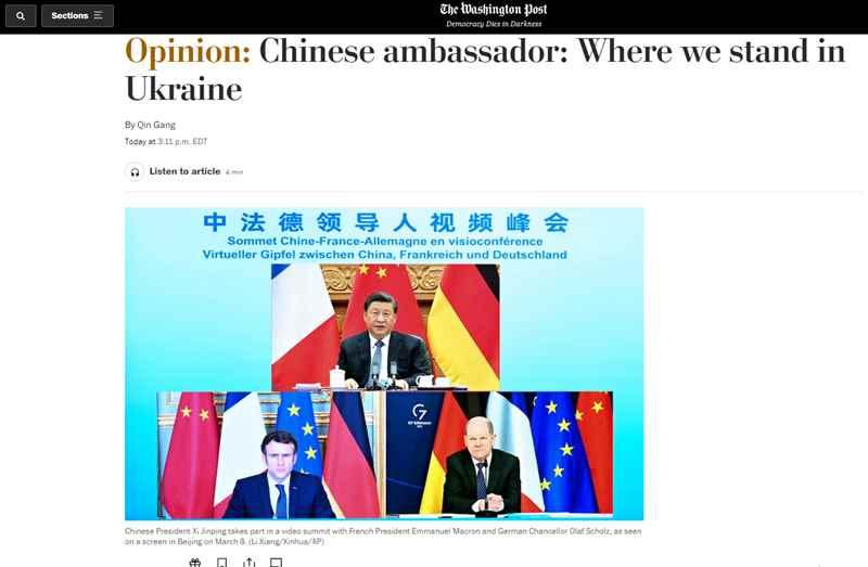 秦剛談烏克蘭局勢:俄烏衝突於中方沒有半點好處香港中通社3月16日電 據中國駐美國大使館網站消息,3月15日,駐美國大使秦剛在《華盛頓郵報》發表題為《我們在烏克蘭問題上的立場》的署名文章。
