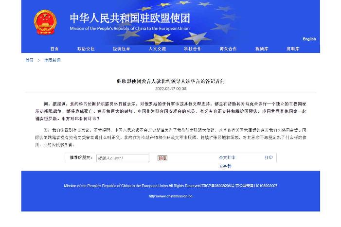 中國駐歐盟使團網站截圖 據報道,北約秘書長斯托爾滕貝格日前表示,對俄羅斯的任何軍事或其他類型支持,都是在幫助其對烏克蘭這樣一個獨立的主權國家發動殘酷戰爭,都將造成死亡、痛苦和巨大的破壞。中國作為聯合國安理會的成員,有義務真正支持和維護國際法,應同世界其他國家一起譴責俄羅斯。 發言人回應,不勞提醒,中國人民永遠不會忘記是誰轟炸了我們駐南聯盟大使館,對其他有關國家遭受的痛苦我們也感同身受。 發言人強調,國際法的踐踏者沒有資格向受害者講什麽叫正義。北約作為冷戰產物和全球最大軍事聯盟,持續擴張區域和領域,對世界和平與穩定起了什麽樣的作用,北約應反躬自省。 【編輯:张丽欣】