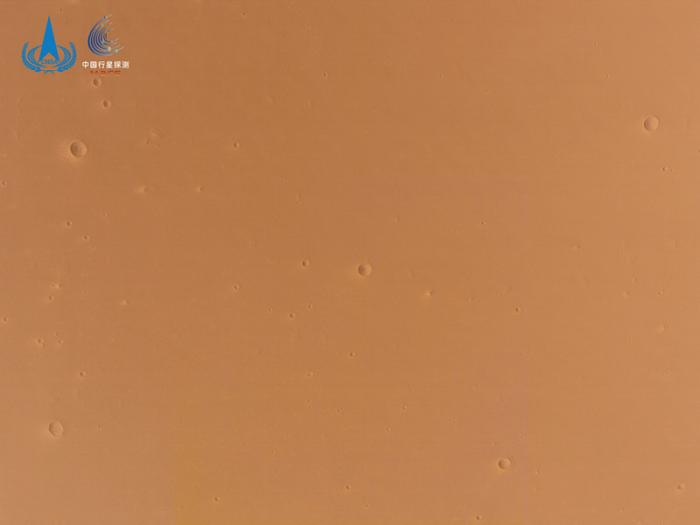 △拍攝於2022年2月10日 圖像中心位置(東經37.8°,北緯72.9°),出現局部沙塵暴,地物難以分辨 “祝融號”著陸巡視區域中分辨率影像 目前,火星北半球已經開始進入秋季。根據以往的探測資料分析,秋季是火星沙塵天氣多發季節,但目前在“祝融號”巡視區尚未觀察到明顯的沙塵天氣。