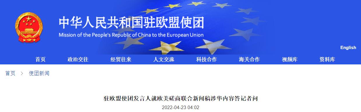 截圖自中國駐歐盟使團官網 中國駐歐盟使團發言人當地時間22日對此回應指出,美歐舉行磋商是它們自己的事,但中方堅決反對拿中國說事,更反對借磋商之名對中國指手畫腳、威脅施壓。美歐聯合新聞稿有關涉華內容粗暴干涉中國內政,無端抹黑攻擊中國,中方對此表示強烈不滿和堅決反對。 發言人表示,這個新聞稿不打自招的是,世界上確有那麼一些國家和組織,打著維護主權和領土完整的招牌,干的卻是破壞別國主權和領土完整的勾當;假借維護和平與安全的名義,實則謀求自身絕對安全的一己私利。這種赤裸裸的雙重標準,只能讓世界人民更加清楚地認識到什麼叫集團政治,什麼叫意識形態霸淩。我們奉勸有關方面不要低估中方捍衛國家主權的堅定決心,不要低估中國人民維護民族尊嚴的堅強意志,認清世界發展大勢,徹底摒棄冷戰思維和拉幫結派做法,多為世界和平、穩定、發展做點實事好事,而不是四處煽風點火、挑動對立對抗。 【編輯:馬華】