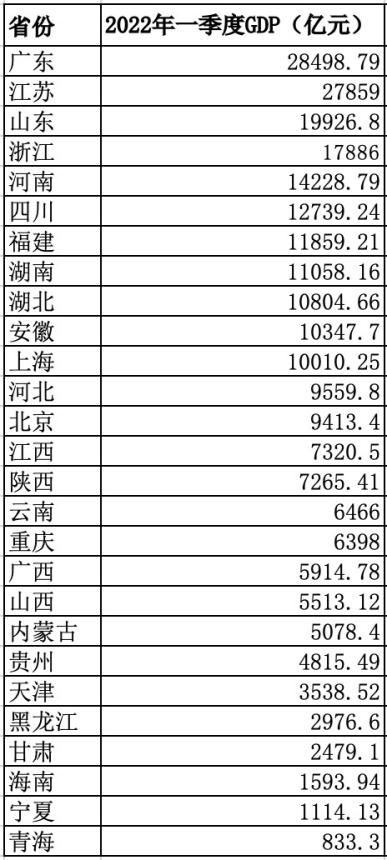 27個省份公佈了2022年一季度GDP數據,數據來自各個省份統計局。澎湃新聞記者 王俊 圖 從數據上看,上述27個省份均實現了正增長。其中,廣東、江蘇、山東、浙江、河南、四川、福建、湖南、湖北、安徽、上海等11個省份今年一季度GDP超過1萬億元。 增速方面,27個省份當中,有21個省份高於全國,北京(4.8%)與全國持平。其中,江西、福建、湖北、貴州、山西、湖南、海南等省份表現亮眼,均高於或者等於6%,江西更是以6.9%的增速在上述27個省份中領跑。 【編輯:馬華】