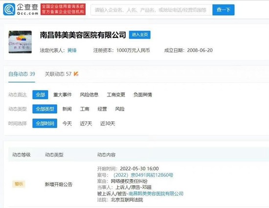 企查查APP顯示,鄧超起訴南昌韓美美容醫院有限公司。網上截圖。 據瞭解,南昌韓美美容醫院公司地址位於江西省南昌市,正是鄧超祖籍所在地。 近年來,美容醫院侵權現象頻頻出現。據公開資料顯示,2016 年,張如意、江金超、毛俊傑、戴姣倩、王秋紫、魯賢瑩六位女星發現自己的照片莫名出現在安徽韓美整形外科醫院管理股份有限公司網站上,被用於商業推廣。遂以侵犯肖像權為由,六人將韓美整形告上合肥廬陽區法院。 庭審中,六位女明星的代理人要求被告立即停止傷害並根據照片數量進行賠償,此外在全國發行的報紙上公開道歉。被告韓美整形的代理人則表示,已停止對六位原告的侵害,願意接受賠償,但對每位女明星只賠償一萬元,包括訴訟費用等在內。此外,韓美整形只願意私下道歉,不同意公開道歉。 同年,白百何、李湘、柳岩、劉敏和劉羽宇5位明星也以侵犯肖像權為由,將安徽韓美整形外科醫院管理股份有限公司告上了合肥市廬陽區法院。 韓美整形醫院相關工作人員表示,案件涉及的疑似侵權行為是發生在多年前,是由於之前的網站編輯工作人員不够負責,直接從網上搜索了照片用於文章配圖和宣傳,並且醫院網站已清理删除了涉嫌侵權的照片。(完) 【編輯:關秀英】