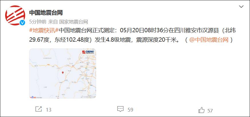 據@中國地震台網消息,中國地震台網正式測定:05月20日08時36分在四川雅安市漢源縣(北緯29.67度,東經102.48度)發生4.8級地震,震源深度20千米。