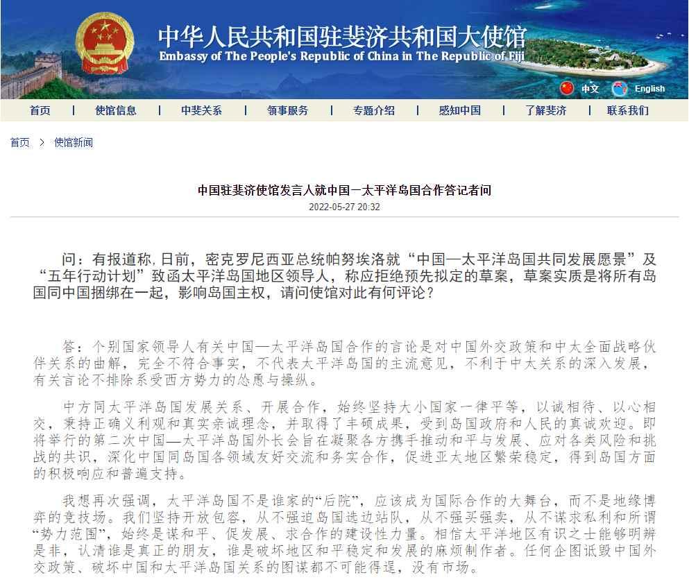 截圖自中國駐斐濟大使館網站 問:有報道稱,日前,密克羅尼西亞總統帕努埃洛就“中國—太平洋島國共同發展願景”及“五年行動計劃”致函太平洋島國地區領導人,稱應拒絕預先擬定的草案,草案實質是將所有島國同中國捆綁在一起,影響島國主權,請問使館對此有何評論? 答:個別國家領導人有關中國—太平洋島國合作的言論是對中國外交政策和中太全面戰略夥伴關係的曲解,完全不符合事實,不代表太平洋島國的主流意見,不利於中太關係的深入發展,有關言論不排除系受西方勢力的慫恿與操縱。 中方同太平洋島國發展關係、開展合作,始終堅持大小國家一律平等,以誠相待、以心相交,秉持正確義利觀和真實親誠理念,並取得了豐碩成果,受到島國政府和人民的真誠歡迎。即將舉行的第二次中國—太平洋島國外長會旨在凝聚各方攜手推動和平與發展、應對各類風險和挑戰的共識,深化中國同島國各領域友好交流和務實合作,促進亞太地區繁榮穩定,得到島國方面的積極響應和普遍支持。 我想再次強調,太平洋島國不是誰家的“後院”,應該成為國際合作的大舞台,而不是地緣博弈的競技場。我們堅持開放包容,從不強迫島國選邊站隊,從不強買強賣,從不謀求私利和所謂“勢力範圍”,始終是謀和平、促發展、求合作的建設性力量。相信太平洋地區有識之士能夠明辨是非,認清誰是真正的朋友,誰是破壞地區和平穩定和發展的麻煩制作者。任何企圖詆毀中國外交政策、破壞中國和太平洋島國關係的圖謀都不可能得逞,沒有市場。 【編輯:馬華】