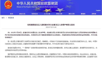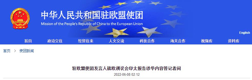 中國駐歐盟使團網站6月8日消息,駐歐盟使團發言人就歐洲議會印太報告涉華內容答記者問。