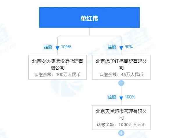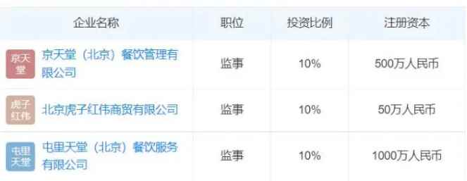 單紅偉控股的公司。截圖自天眼查 單紅偉和詹小虎兩人還在多家存續經營狀態的公司擔任股東,這些公司的註冊資本合計1650萬元,加上實際控制的北京天堂超市管理有限公司的註冊資本,將達2650萬元。 其中,單紅偉在2家存續經營狀態的公司擔任股東,分別是北京虎子紅偉商貿有限公司,單紅偉持股90%,詹小虎持股10%,註冊資本50萬元;北京安達捷運貨運代理有限公司,單紅偉持股100%,註冊資本100萬元。而北京虎子紅偉商貿有限公司100%持股北京天堂超市管理有限公司。 北京天堂超市管理有限公司名下則有兩家企業,分別為屯裏天堂(北京)餐飲服務有限公司和京天堂(北京)餐飲管理有限公司,持股均為90%,另外的10%股份為詹小虎持有。 而詹小虎擔任股東的存續經營狀態的公司有3家,分別是京天堂(北京)餐飲管理有限公司、北京虎子紅偉商貿有限公司、屯裏天堂(北京)餐飲服務有限公司,合計註冊資本1550萬元。