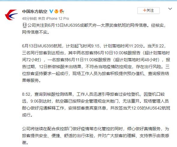 圖:東航微博截圖 6月13日MU6395航班,計劃起飛時間9:15,計劃落地時間11:20分。當天8:22,三名同行旅客到達櫃台,其中兩名旅客持6月10日10:00核酸報告(超計劃落地時間72小時),一名旅客持6月11日11:00核酸報告(超計劃落地時間48小時),報告過期,12日新做核酸未出結果,不符合當地疫情防控規定,存在出行風險。三位旅客堅持要求一起成行,現場工作人員為旅客積極提供預辦值機、查詢報告結果等服務。 8:52,查詢到核酸檢測結果,工作人員迅速引導旅客過安檢登機,因登機口較遠,9:06到達時,航空器已按照安全管理規定關艙門,無法重開。現場管理人員耐心做好溝通解釋工作,安排旅客貴賓室休息,并改簽當天12:05的MU5642航班成行。 東方航空表示,將繼續在配合疾控部門做好疫情常態化管控的同時,傾心做好真情服務,為旅客提供安全、便捷、舒適的出行體驗,并對廣大旅客的理解、支持表示由衷感謝。(完) 【編輯:葉永成】