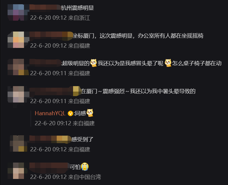 此前消息稱,地震造成台灣全島震感強烈,福建震感明顯。來自福建廈門、浙江等地的網友,在中國地震台網速報相關微博下紛紛留言,表示自己所在的地方也有震感,“震感明顯”。