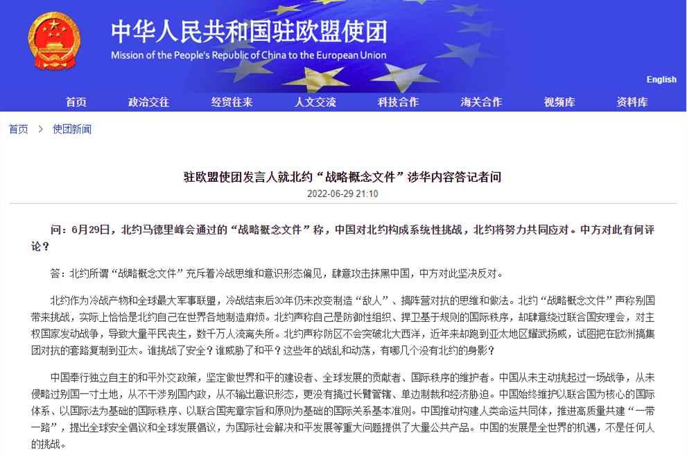 中國駐歐盟使館網站截圖 有記者問,當日北約馬德里峰會通過“戰略概念文件”,聲稱中國對北約構成“系統性挑戰”,北約將努力共同應對。中方對此有何評論? 中國駐歐盟使團發言人表示,北約所謂“戰略概念文件”充斥冷戰思維和意識形態偏見,肆意攻擊抹黑中國,中方對此堅決反對。 發言人指出,北約作為冷戰產物和全球最大軍事聯盟,冷戰結束後30年仍未改變製造“敵人”、搞陣營對抗的思維和做法。北約“戰略概念文件”聲稱別國帶來挑戰,恰恰是北約自己在世界各地製造麻煩。北約聲稱自己是防禦性組織、捍衛基於規則的國際秩序,卻肆意繞過聯合國安理會,對主權國家發動戰爭,導致大量平民喪生,數千萬人流離失所。北約聲稱防區不會突破北大西洋,近年來卻跑到亞太地區耀武揚威,試圖把在歐洲搞集團對抗的套路複製到亞太。誰挑戰了安全?誰威脅了和平?這些年的戰亂和動蕩,有哪幾個沒有北約的身影? 發言人表示,中國奉行獨立自主的和平外交政策,堅定做世界和平的建設者、全球發展的貢獻者、國際秩序的維護者。中國從未主動挑起過一場戰爭,從未侵略過別國一寸土地,從不干涉別國內政,從不輸出意識形態,更沒有搞過長臂管轄、單邊制裁和經濟脅迫。中國始終維護以聯合國為核心的國際體系、以國際法為基礎的國際秩序、以聯合國憲章宗旨和原則為基礎的國際關係基本準則。中國推動構建人類命運共同體,推進高質量共建“一帶一路”,提出全球安全倡議和全球發展倡議,為國際社會解決和平發展等重大問題提供了大量公共產品。中國的發展是全世界的機遇,不是任何人的挑戰。 發言人敦促北約停止以意識形態劃線挑動對抗,放棄冷戰思維、零和博弈的做法,停止散布針對中方的虛假信息和挑釁言論,同時表示“既然北約已將中國定位為‘系統性挑戰’,那我們也不得不高度關注,統籌應對。對侵犯我們利益的行徑,我們會堅決有力回擊”。(完) 【編輯:凌玉辉】