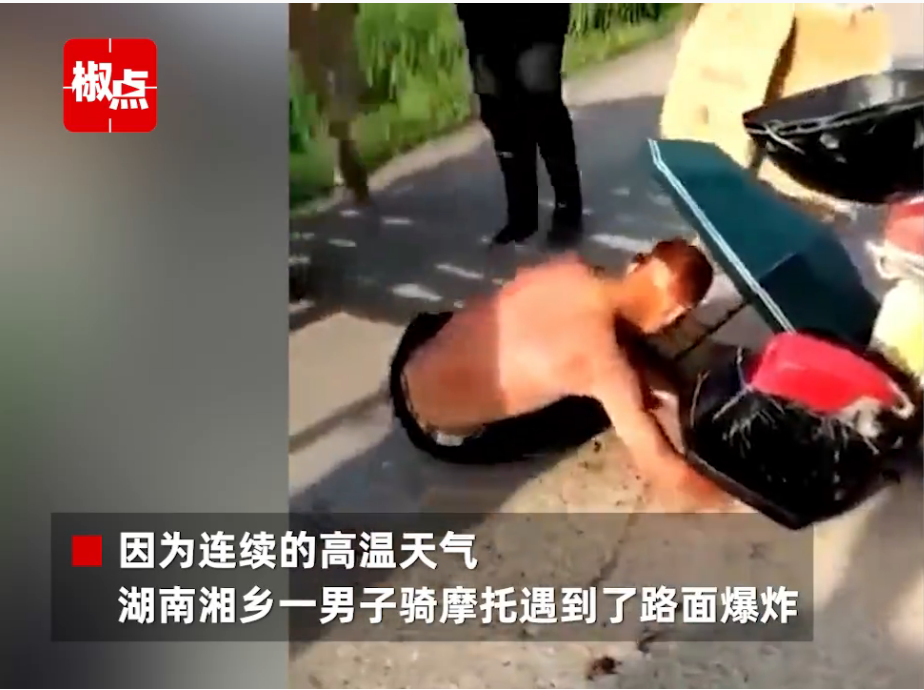 香港新聞網7月15日電 近期,中國南方地方氣溫火力全開,高溫天氣持續。在湖南,多地頻繁高溫預警,部分地區將達37度以上。 據封面新聞報道,7月11日,在湖南湘鄉,一男子騎摩托中行駛中,遇路面爆炸,直接被甩出20多米遠,全身多處可見擦傷。 知情人士表示,由於連日高溫,水泥路面受熱膨脹,最終導致開裂、崩壞,直接將路過的騎摩托男子給甩了出去。 由於地面滾燙,附近居民看到將男子抬上木板,並撥打120電話送往醫院。