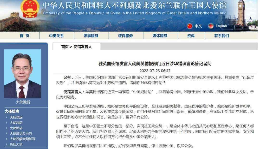 中國駐英使館:敦促美英情報部門停止誣蔑中國分享到:
