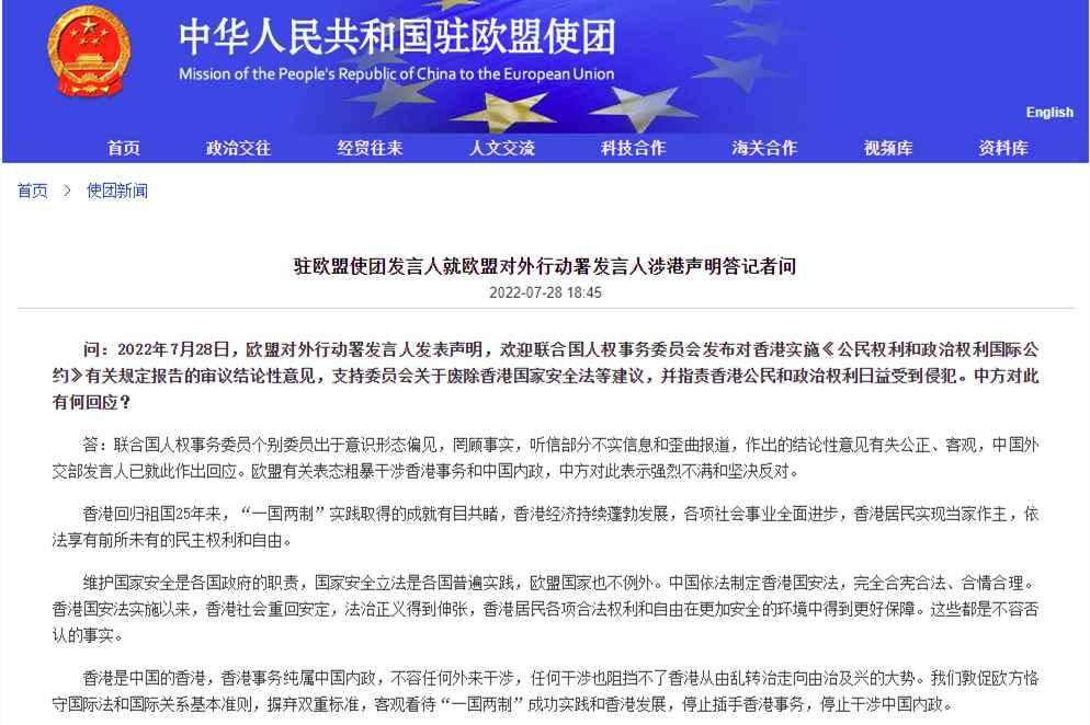 網頁截圖 中國駐歐盟使團網站消息,有記者問,當日歐盟對外行動署發言人發表聲明,稱歡迎聯合國人權事務委員會發布對香港實施《公民權利和政治權利國際公約》有關規定報告的審議結論性意見,支持委員會關於廢除香港國家安全法等建議,中方對此有何回應? 中國駐歐盟使團發言人表示,聯合國人權事務委員會個別委員出於意識形態偏見,罔顧事實,聽信部分不實信息和歪曲報道,其結論性意見有失公正、客觀,中國外交部發言人已作出回應。歐盟有關表態粗暴干涉香港事務和中國內政,中方對此表示強烈不滿和堅決反對。 發言人強調,香港回歸祖國25年來,“一國兩制”實踐取得的成就有目共睹,香港經濟持續蓬勃發展,各項社會事業全面進步,香港居民實現當家作主,依法享有前所未有的民主權利和自由。 發言人指出,國家安全立法是各國普遍實踐,歐盟國家也不例外。中國依法制定香港國安法,完全合憲合法、合情合理。香港國安法實施以來,香港社會重回安定,法治正義得到伸張,香港居民各項合法權利和自由在更加安全的環境中得到更好保障,這些都是不容否認的事實。 發言人表示,香港是中國的香港,香港事務純屬中國內政,不容任何外來干涉,任何干涉也阻擋不了香港從由亂轉治走向由治及興的大勢。中方敦促歐方恪守國際法和國際關係基本準則,摒棄雙重標準,客觀看待“一國兩制”成功實踐和香港發展,停止插手香港事務,停止干涉中國內政。(完) 【編輯:凌玉辉】