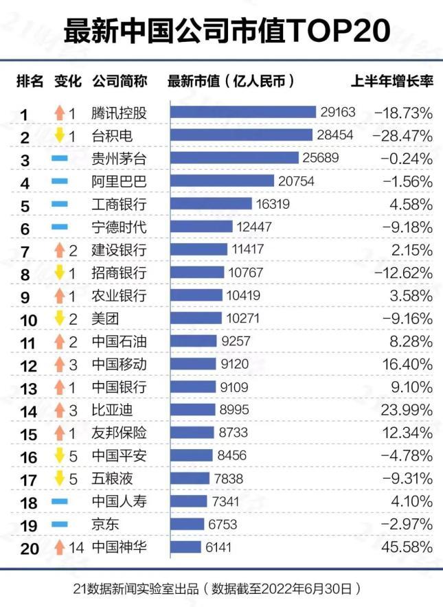 中國500強上市公司,都在哪些城市?2022年已過半,中國企業在資本市場的表現如何? 截至2022年6月底,中國上市公司共8392家(在全球16個主要交易所上市的),相比去年年末增加116家,總市值130.22萬億元人民幣,相比去年年末降低8%。 過去半年,中國萬億市值企業的數量保持不變,依然是10家。 但千億市值公司數量減少了25家,降至218家,主要集中在電子、醫藥生物、信息技術、銀行、電力設備等行業。 當然,我們最關心的還是一個歷久彌新的老話題: 中國最優秀的500家上市公司,都分布在哪些城市? 01 市值20強企業排名: 騰訊超台積電 首先來看下,中國市值20強。