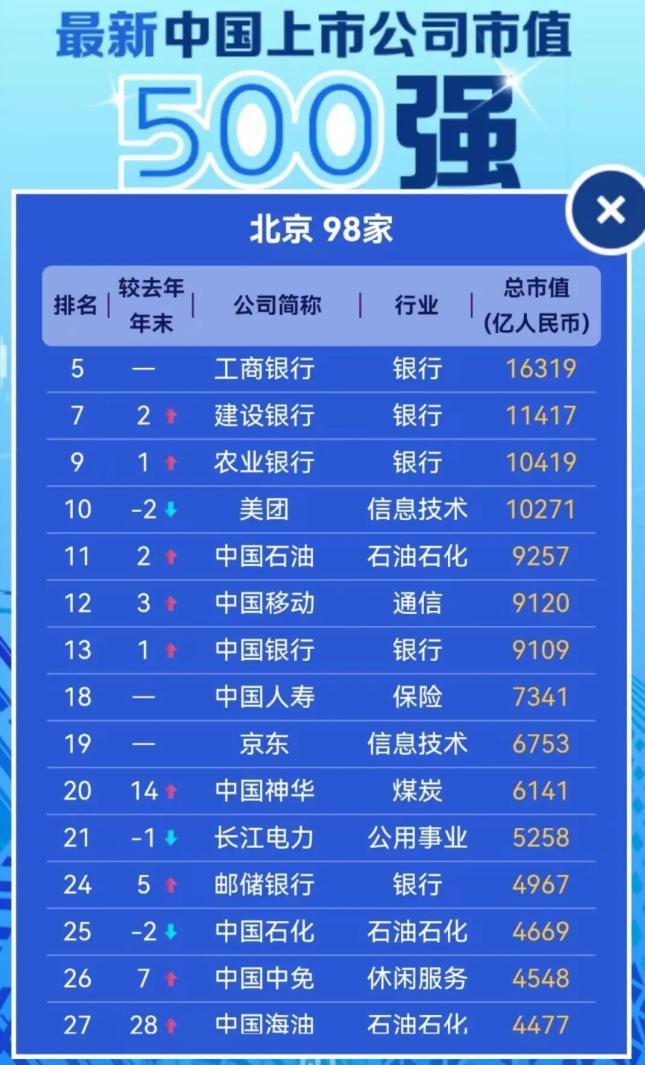 北京共有98家中國市值500強公司總部,總市值近22萬億,體量接近全部500強的28%。 相比去年底,北京還減少了3家上榜企業。 而且,TOP20巨頭,北京坐擁10家,占據半壁,如工商銀行、建設銀行、農業銀行、美團等。 北京為什麽有如此多的上市巨頭? 主要歸功於北京是央企第一總部,北京聚集了銀行、石油石化等大批產業巨頭,市值非常龐大。