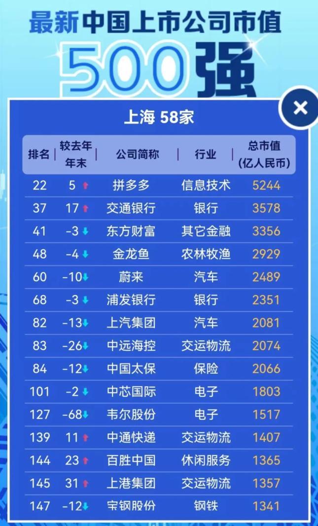 第二名是,上海。 500強上市公司中,上海共有58家上榜企業。 其中,市值最高的為拼多多,總市值5244億元人民幣,排名全國第22。 相比去年底,上海增加了2家。