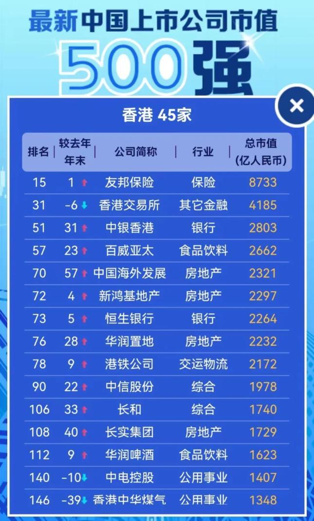 第三名,香港。 香港共有45家上榜企業。 其中,市值最高的為友邦保險,總市值8733億元人民幣,排名全國第15。 相比去年底,香港增加了3家。