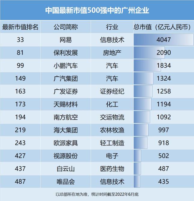 第四名,深圳。 深圳共有37家企業上榜。 TOP20巨頭,深圳坐擁4家,包括市值全中國第一的騰訊控股、招商銀行、比亞迪、中國平安。 第五名,台北,共有27家企業上榜。 可能有人會問,另一座一線城市廣州呢? 廣州共有12家企業上榜。 其中,網易市值最高,為4047億元,市值全國第33,是廣州第一大上市公司。 保利發展,位居廣州第二,總市值2090億元。 小鵬汽車,位居廣州第三,總市值1834億元。