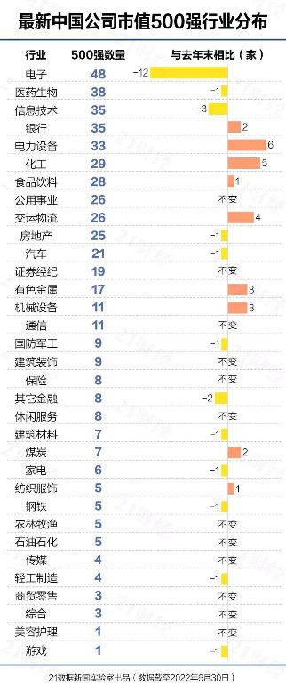 03 500強上市公司的行業分布 再來看下行業分布。 500強上市公司,集中在電子(48家)、醫藥生物(38家)、信息技術(35家)、銀行(35家)、電力設備(33家)等行業。 值得註意的是,過去半年,行業風向轉變。 新能源、煤炭行業風頭正盛,煤炭上半年板塊漲幅超過30%,還湧現出中國神華這家全國市值20強。 此外,交通運輸等行業復蘇明顯。 不過與半年前相比,以半導體為代表的電子行業在上半年迅速降溫,板塊跌超25%。 全中國市值500強中,電子公司大減12家。 另外,互聯網、醫藥生物等板塊繼續下滑,電子、互聯網、信息技術等板塊公司市值跌幅明顯。��