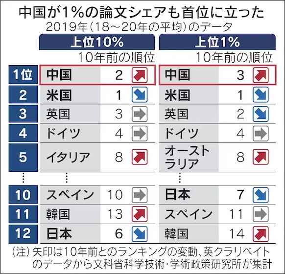 日經新聞圖片 日本文部科學省的研究所8月9日發布的最新報告顯示,即使是研究人員的引用次數進入前1%的“頂尖論文”,中國也首次超過美國,與論文總數和引用次數進入前10%的“受關注論文”篇數一同躍居首位。 報道說,科學論文篇數是衡量一國研究活動情況的基本指標。日本文部科學省科學技術與學術政策研究所根據英國調查公司科睿唯安(Clarivate)的數據,分析了主要國家的論文篇數等。由於波動巨大,按3年平均計算了2019年(2018~2020年的平均)的數據。 報道指出,研究論文被其他研究人員引用的次數越多,越被評價為質量高。引用次數進入前1%的“頂尖論文”稱得上引領相關領域的最卓越的研究。中國“頂尖論文”的篇數為4744篇,超過美國的4330篇。從份額來看,中國占27.2%,美國占24.9%,明顯超過居第3位英國的5.5%。 科學研究稱得上經濟等產業的競爭力的源泉。現在的研究實力將影響人工智能(AI)和量子技術等最尖端領域的未來市場競爭,還直接關係到安全保障等。 報道強調,中國的增長迅猛。在2年前的調查和去年的調查中,論文總數以及被視為質量高的引用次數進入前10%的受關注論文的篇數先後超過美國,躍居首位。 在此次調查中,中國的論文總數達到40萬7181篇,比美國的29萬3434篇高出10萬篇以上。受關注論文的份額為26.6%,超過美國(21.1%)。領先美國的優勢正在擴大。 對於中國的實力和今後的走向,日本科學技術振興機構(JST)亞洲與太平洋綜合研究中心的副中心長黑木慎一認為,中國的論文在數量和質量上均達到世界頂尖水平。要在科學技術上做到真正的世界第一,能否持續排在第1位、不斷創造出被國際認可的成績將是關鍵。(完) 【編輯:凌玉辉】