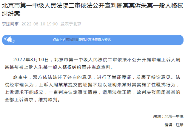 北京一中院:朱某對周某某性騷擾行為證據不足,維持原判分享到: