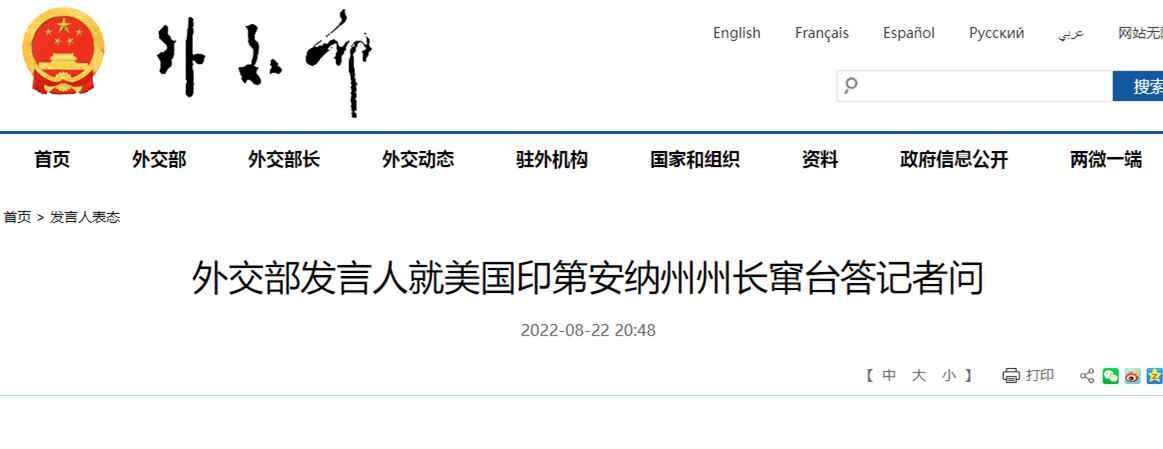 香港中通社8月22日電 中國外交部發言人22日就美國印第安納州州長訪台答記者問。
