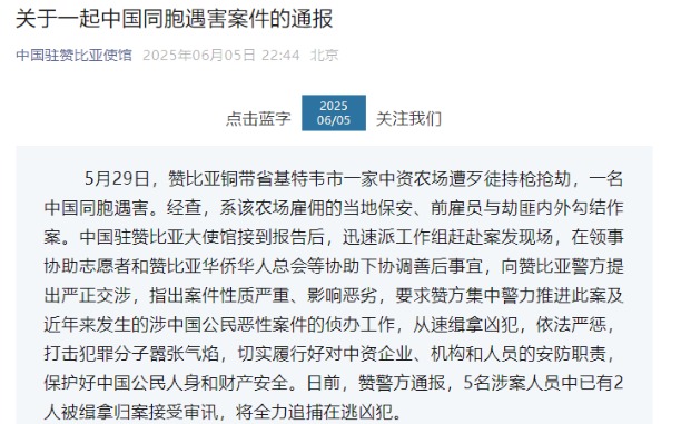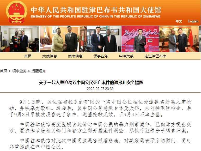 截圖。圖源:中國駐津巴布韋大使館網站 據通報,9月1日晚,居住在布拉瓦約礦區的一名中國公民在住處遭數名劫匪入室搶劫,並被暴力毆打。遇襲後,該中國公民感覺身體無大礙,未前往醫院檢查,後於9月3日早被發現昏迷於家中,送醫搶救無效,9月4日不幸去世。 津巴布韋是非洲東南部的內陸國,東鄰莫桑比克,南接南非,西和西北與博茨瓦納、贊比亞毗鄰。據中國領事服務網介紹,津巴布韋社會治安狀況總體良好,夜間治安較差。常見犯罪案件主要是偷盜和搶劫。 中國駐津巴布韋大使館提醒在津公民務必提升安全防範意識。居所應安裝監控、防盜門等必要安防設施,企業應聘用安保力量;避免在家中存放大量現金,勿向外人透露家中具體情況;嚴格守法經營,重視對員工的背景審查和日常觀察,警惕內外勾結作案。 近年來,隨著津巴布韋經濟形勢持續惡化,以及受新冠肺炎疫情影響導致失業率增加,發生多起中國公民住宅或企業駐地遭武裝團夥搶劫案件。 2020年9月,四名持槍武裝劫匪潛入哈拉雷一名僑胞家中實施搶劫,該華僑發現後開槍自衛,劫匪在激戰中逃竄。 2020年11月,中使館通報,有中國公民外出回家時遭遇搶劫並負傷。 【編輯:馬華】