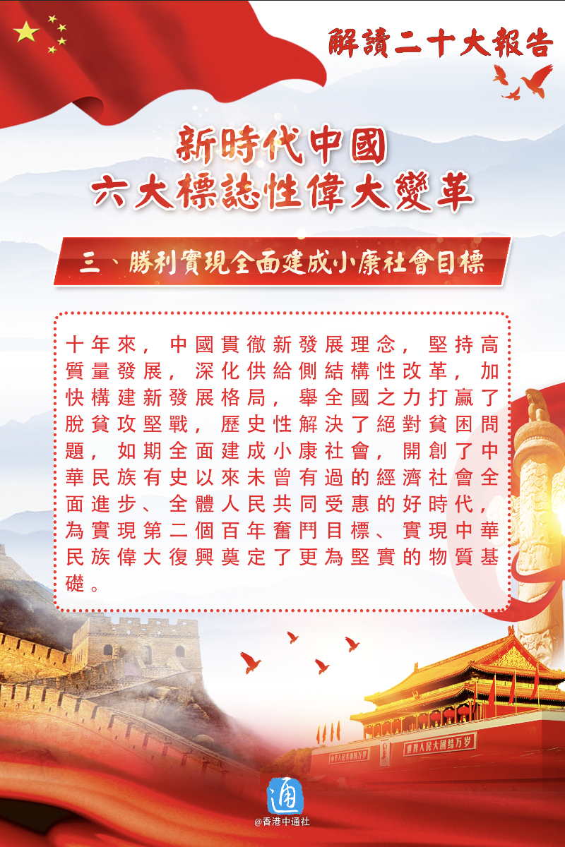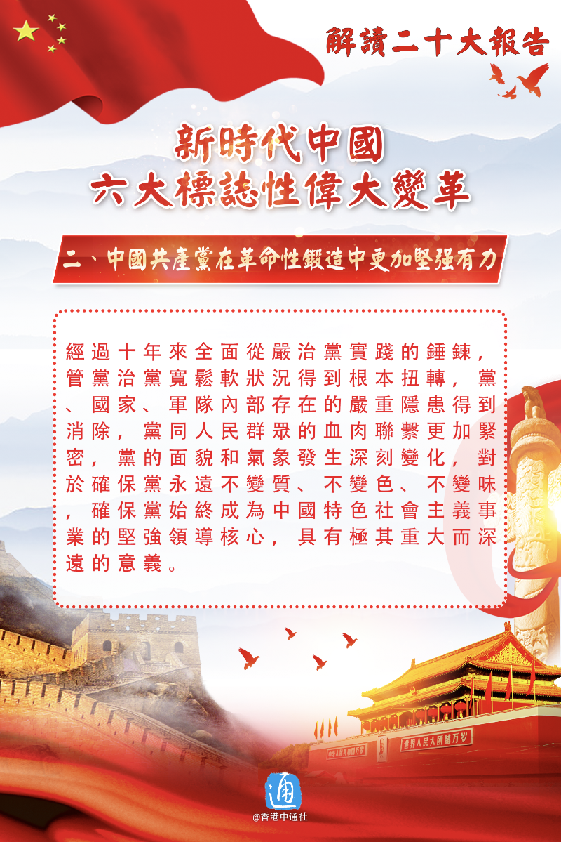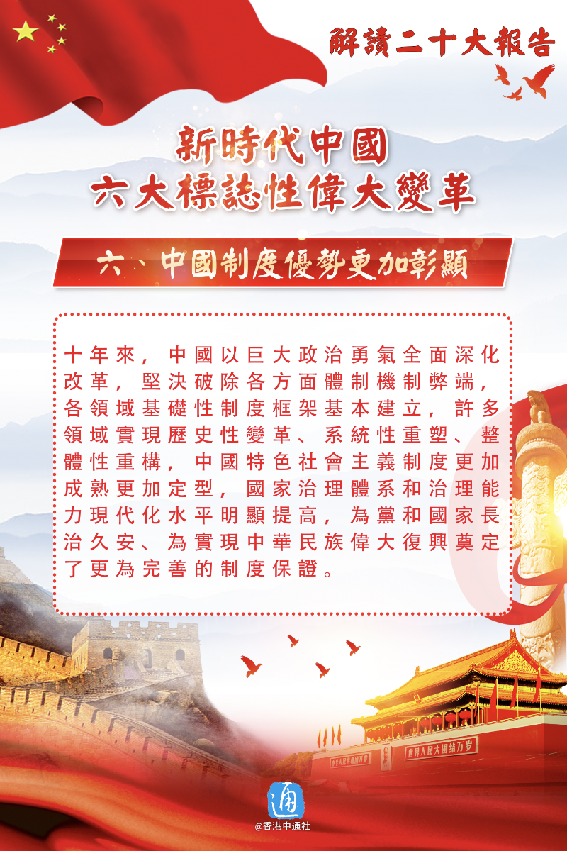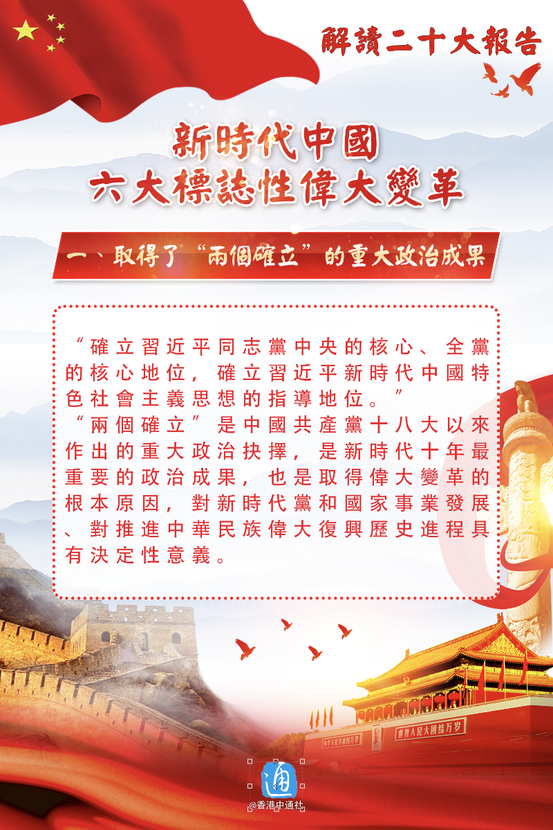 香港新聞網10月24日電 中共中央今日(24日)上午舉行新聞發布會,介紹解讀黨的二十大報告。二十大報告從16個方面總結概括了十年來的偉大變革,最具標誌性的意義有6個方面。戳圖了解!