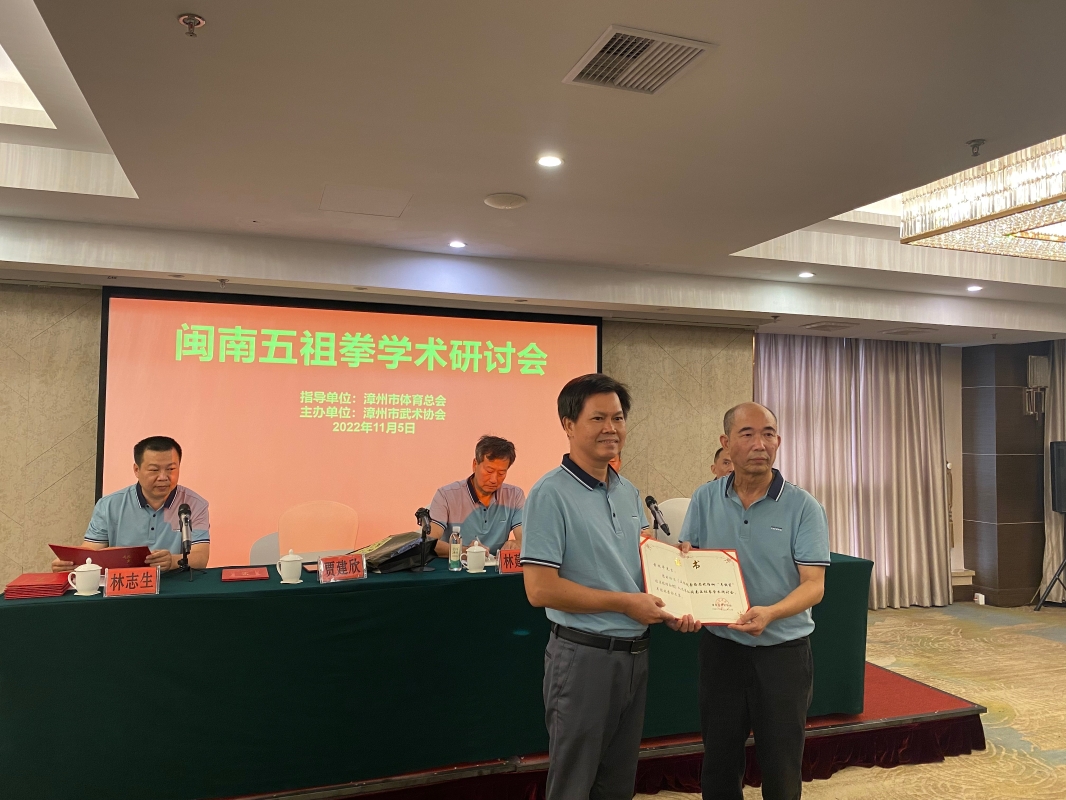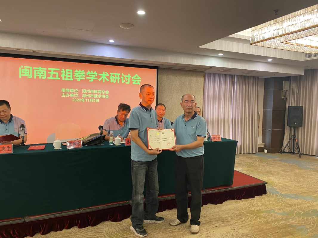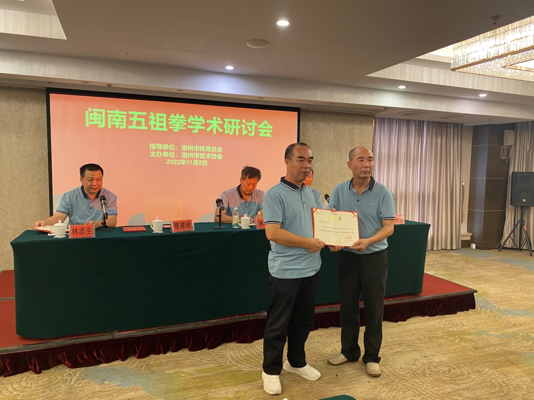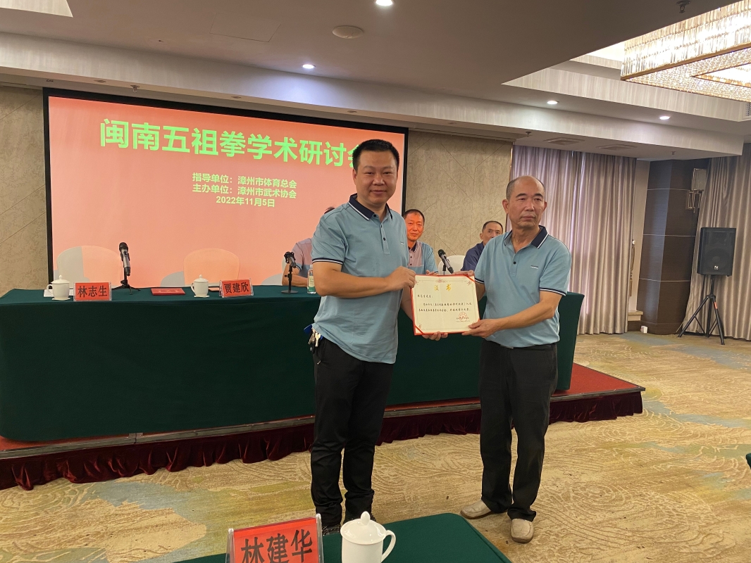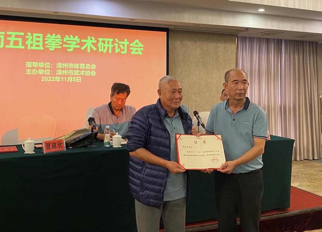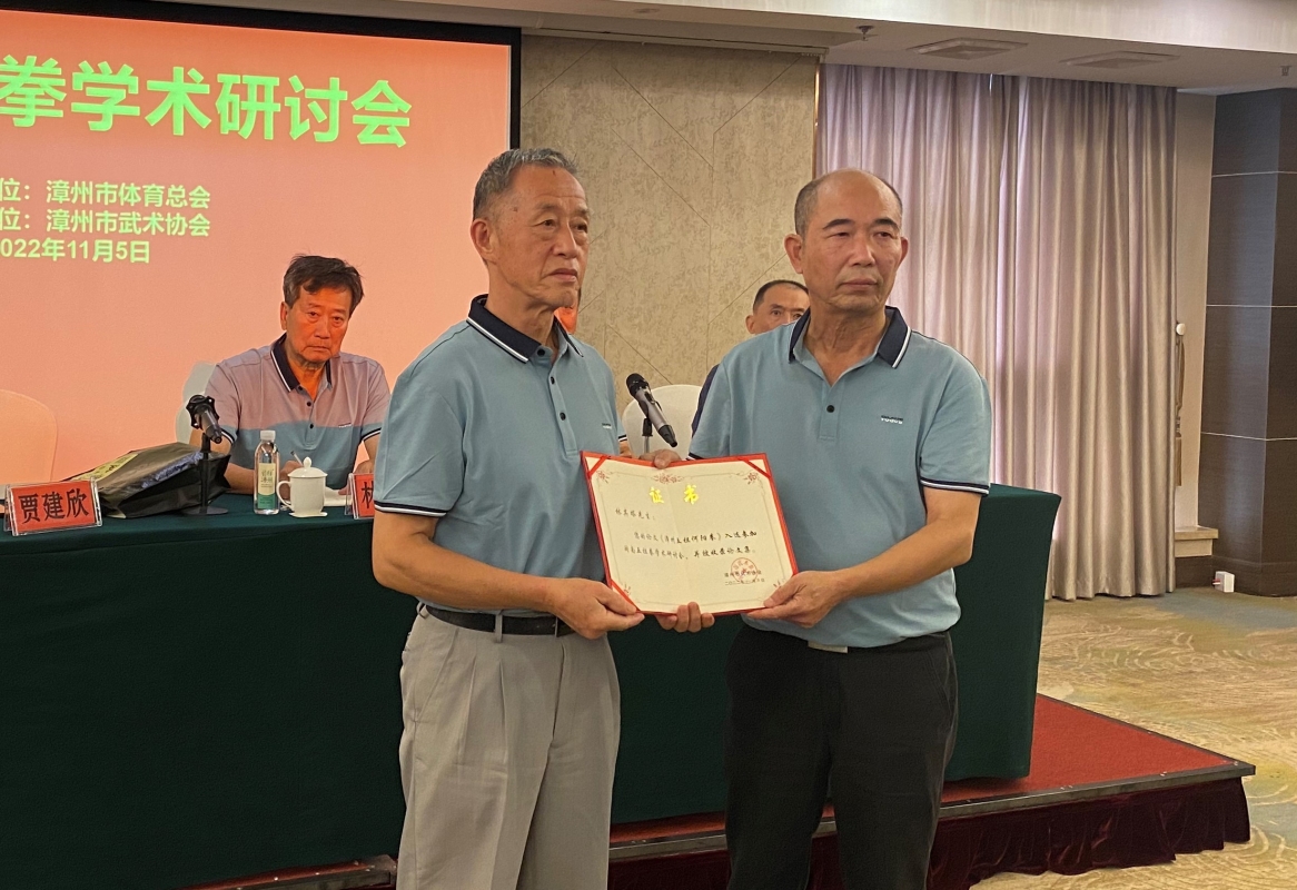 漳州市武術協會會長賈建欣(右)為五祖拳傑出代表人物周明渊頒發論文入選證書。