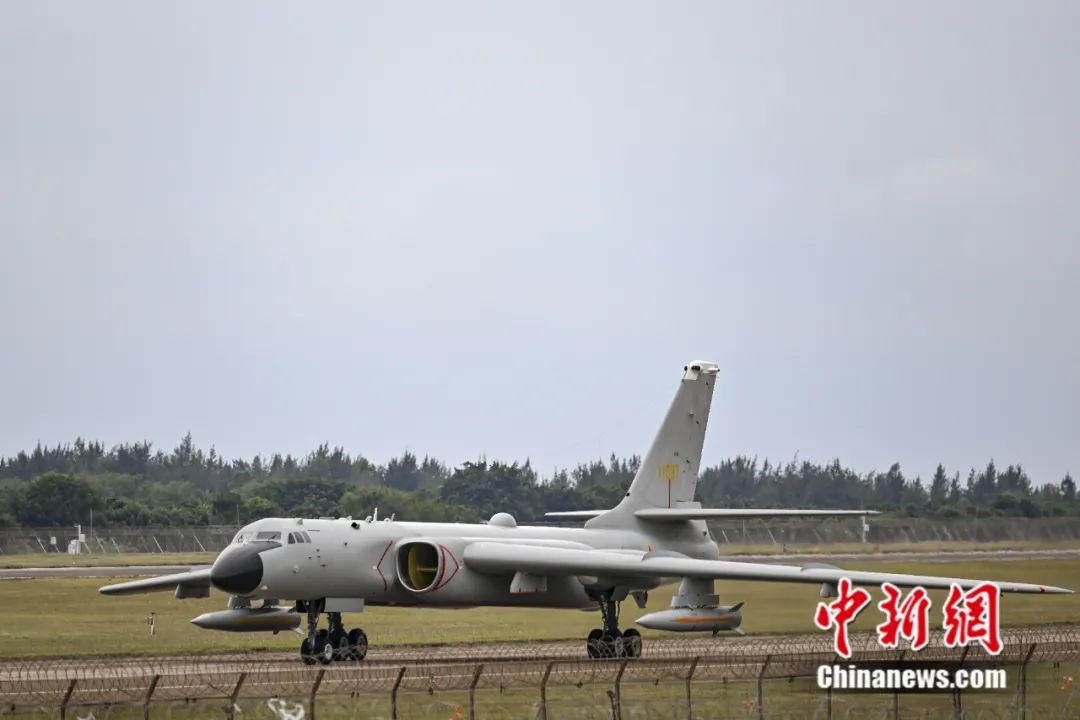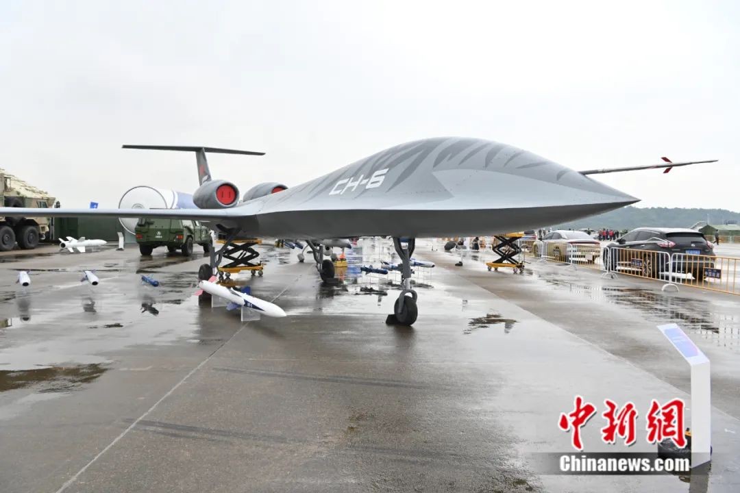 圖為空軍轟-6K戰機抵達珠海金灣機場(中新社) 翼龍、雲影和旋戈等三大軍貿無人機系列將在本屆航展齊齊亮相,其中,翼龍-3無人機真機首次公開。