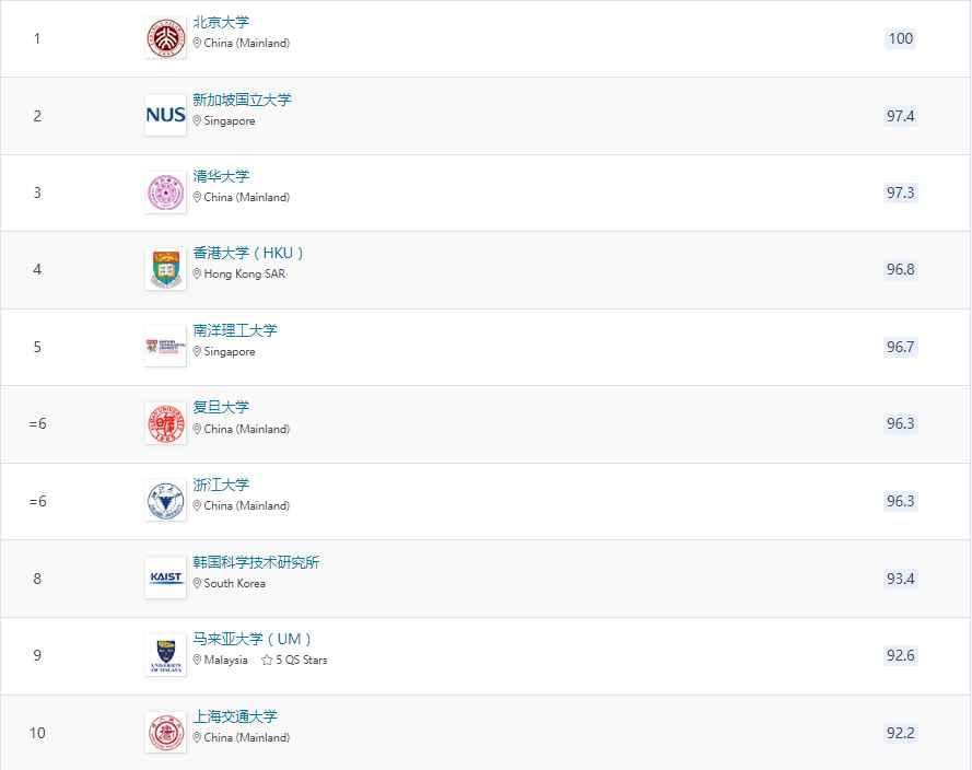 QS官網截圖 2023QS亞洲大學排名共涉及760所院校,為歷年最多。中國186所大學進入QS2023亞洲大學排行榜,數量居亞洲第一。其次是印度(118所)、日本(106所)。 其中,中國內地128所,新增2所,香港9所,台灣47所,澳門2所。 北京大學首次獲得2023QS亞洲地區大學排名第1;而連續五年蟬聯亞洲榜首的新加坡國立大學今年未能衛冕,排名下降至第2位,清華大學緊隨其後,位列第3;浙江大學、復旦大學並列亞洲第6,上海交通大學位居亞洲第10。此外,南京大學、中國科學技術大學、武漢大學和中山大學均躋身前50。 香港上榜的大學排名都有所下降,香港大學下降一位,位居第4名,香港科技大學排名下降五位,居第14位,香港中文大學排名也下降一位,但總體排名超過香港科技大學,居第12位。 澳門有2所大學上榜,分別是澳門大學(第101位)和澳門科技大學(第215位)。 台灣大學是唯一進入亞洲排名前20的來自台灣地區的大學院校。 新加坡有2所高校進入榜單前10位,新加坡國立大學排名下降至第2位,南洋理工大學下降至第5位。 與2009年首屆QS亞洲大學排名相比,進入亞洲前10的中國內地高校由1所增長至5所,進步顯著。(完) 【編輯:凌玉辉】