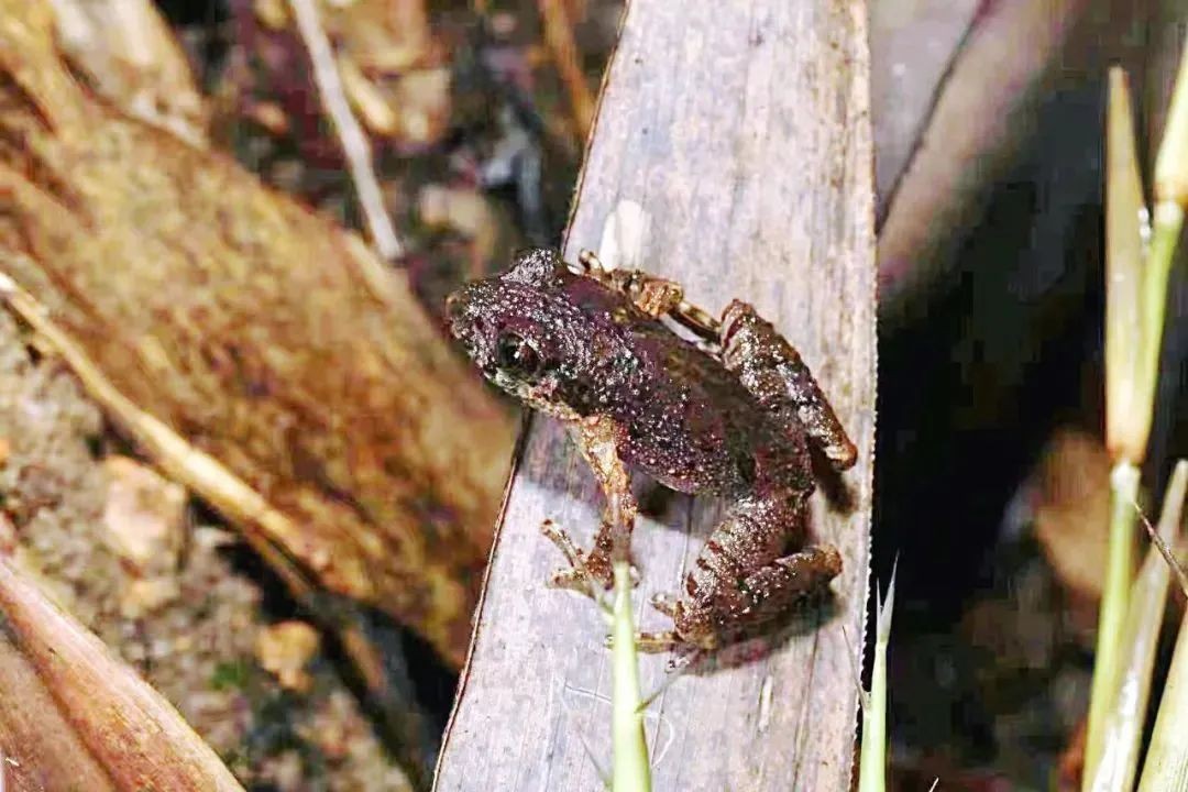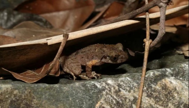密疣掌突蟾 圖:央廣網 廣東連山筆架山省級自然保護區位處連山壯族瑤族自治縣。今年5月,該保護區工作人員在對保護區核心區域進行生物多樣性監測過程中,突然聽到了一陣輕微的蟲鳴聲。常年與動植物為伴的他們察覺出了不同尋常之處,參與監測項目的廣東環境保護工程職業學院專家林石獅等隨即循聲而去。 “當時我們在做夜間調查,大概晚上七點上山,我們沿著山里小路一直走。夏天蟲鳴聲比較多,這些聲音中混雜一種比較微弱但是比較特別的蟲叫,我們就開始尋找聲源。”林石獅回憶,當時他們沿著六七十度的陡坡,跟著季節性溪流往上爬,差不多找了5、6個多小時,最後在一堆枯枝落葉里發現了“蟲鳴”的真身。