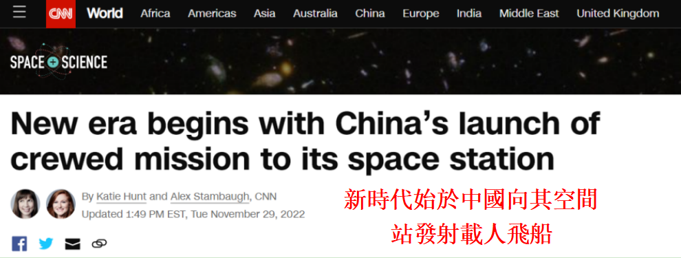 美國有線電視新聞網報道截圖 文章稱,本周二(29日),三名中國宇航員入駐即將完工的中國空間站,這標誌著中國在太空長期駐留的開始。 這是中國太空項目的重大里程碑,意味著老舊的國際空間站不再是地球軌道上人類唯一的長期居住地。 三名中國航天員將在空間科學研究、空間醫學和空間技術等領域開展40多項實驗和測試,以及進行三到四次的出艙活動。