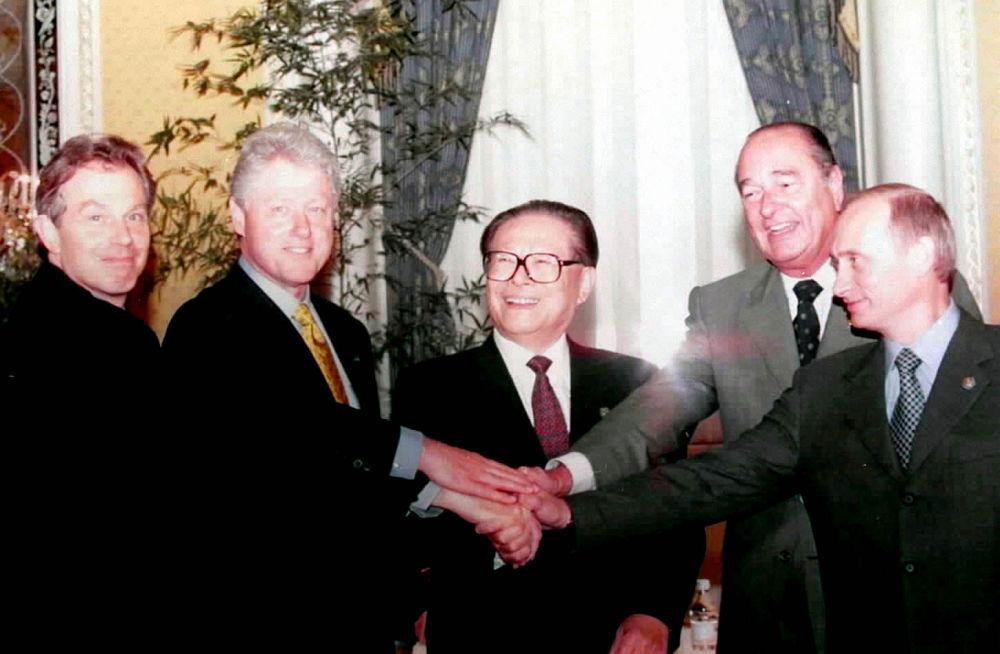 2000年9月7日,由中國倡議的聯合國安理會五個常任理事國首腦會議在紐約舉行。江澤民同志(中)同法國總統希拉克(右二)、俄羅斯總統普京(右一)、英國首相布萊爾(左一)、美國總統克林頓(左二)握手合影。新華社發