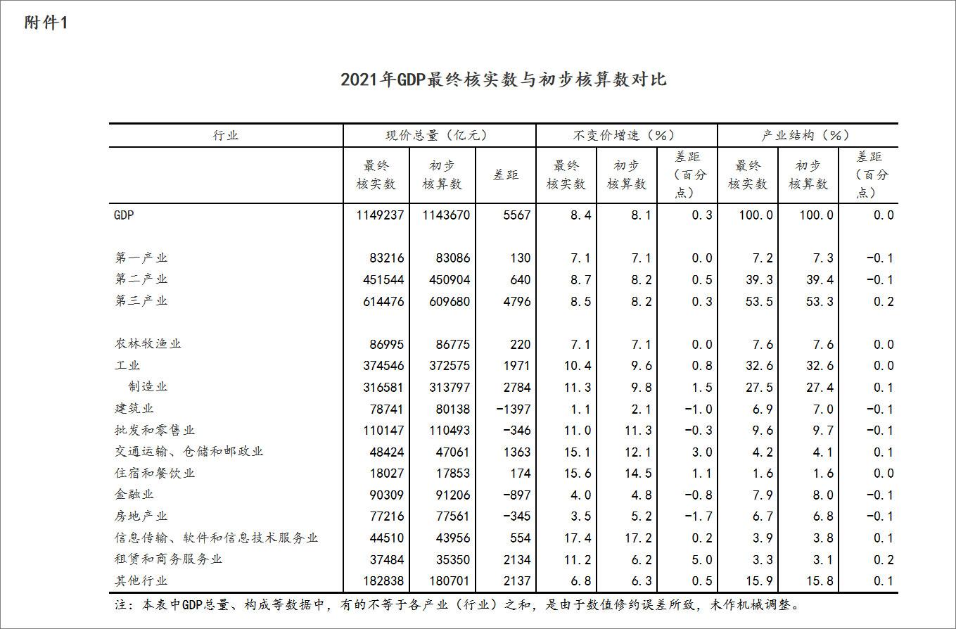 香港新聞網12月27日電 據國家統計局官網,12月27日,其發佈國家統計局關於2021年國內生產總值最終核實的公告。 按照我國國內生產總值(GDP)核算和數據發佈制度規定,年度GDP核算包括初步核算和最終核實兩個步驟。近日,根據國家統計局統計年報、財政部財政決算和有關部門年度財務資料等,國家統計局對2021年GDP數據進行了最終核實,主要結果如下: 經最終核實,2021年,GDP現價總量為1149237億元,比初步核算數增加了5567億元;按不變價格計算,比上年增長8.4%,比初步核算數提高0.3個百分點。三次產業和各行業數據見附表。 特此公告。