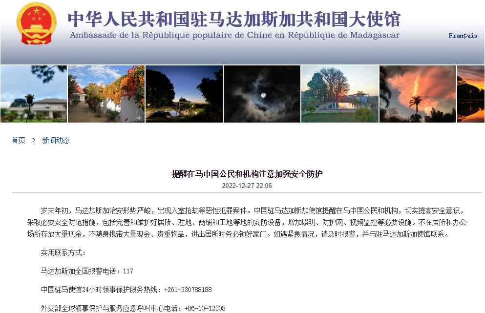 截圖。圖源:中國駐馬達加斯加大使館網站 駐馬達加斯加使館提醒,採取的安全防範措施包括完善和維護好居所、駐地、商鋪和工地等地的安防設備,增加照明、防護網、視頻監控等必要設施。不在居所和辦公場所存放大量現金,不隨身攜帶大量現金、貴重物品,進出居所時務必鎖好家門。 如遇緊急情況,請及時報警,並與駐馬達加斯加使館聯繫。實用聯繫方式為,馬達加斯加全國報警電話是117;中國駐馬使館24小時領事保護服務熱線是+261-330788188;外交部全球領事保護與服務應急呼叫中心電話為+86-10-12308。(完) 【編輯:馬華】