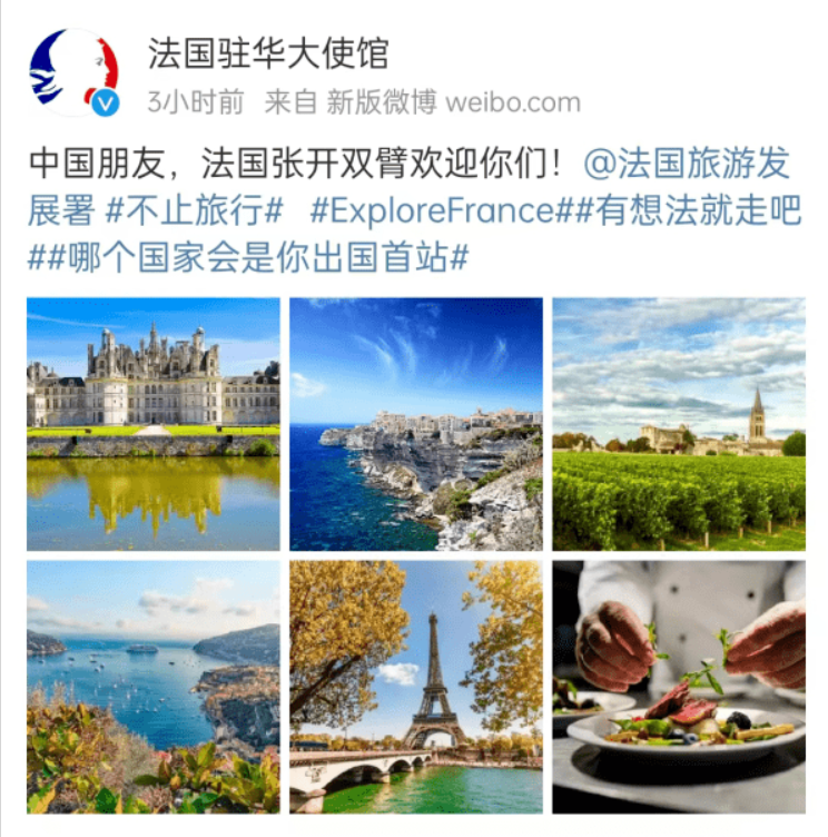 其中,法國駐華大使館表示,“中國朋友,法國張開雙臂歡迎你們!” 【編輯:石欢欢】