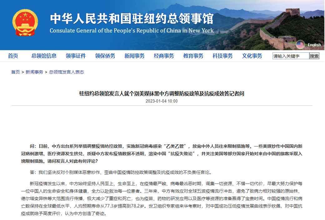 截圖自中國駐紐約總領館網站 問:日前,中方出台系列舉措調整疫情防控政策,實施新冠病毒感染“乙類乙管”,放寬中外人員往來限制措施等。一些美媒炒作中國國內新冠病例激增、醫療資源發生擠兌,質疑中方發佈疫情數據不透明,渲染中國“抗疫失敗論”,並關注美國等部分國家開始對來自中國的旅客採取入境限制措施。請問發言人對此有何評論? 答:我們堅決反對個別媒體惡意炒作、歪曲中國疫情防控政策調整及抗疫成效的不負責任言論。 新冠疫情發生以來,中方始終堅持人民至上、生命至上,在疫情最嚴峻、病毒最兇惡時期,調集一切資源、不惜一切代價,盡最大努力保護每一位中國人的生命安全和身體健康,全力以赴救治每一位患者。三年來,中方有效應對全球五波疫情流行衝擊,避免了致病力相對較強的原始株、德爾塔變異株等大範圍流行傳播,極大減少了重癥和死亡,也為疫苗、藥物的研發應用以及醫療等資源的準備贏得了寶貴時間。中國疫情流行和病亡數保持在全球最低水平,人均預期壽命從77.3歲提高到78.2歲。世衛組織專家組來華考察時,對中國成功壓低疫情發展曲線表示欽佩,對中國抗疫成就給予高度評價,認為中方創造了奇跡。 中國不僅維護本國人民生命健康安全,還積極呼應國際社會團結抗疫,率先提出將疫苗作為國際公共產品。我們說到做到,迄今已向全球提供20億劑疫苗和大量抗疫物資,並向世衛組織提供捐款,中國本著公開透明的負責任態度,從疫情一開始就同各國分享信息,助力國際社會應對疫情。疫情發生以來,駐紐約總領館向領區捐贈大量口罩、防護服、防護手套等防疫物資,積極協助紐約、馬薩諸塞、俄亥俄、賓夕法尼亞等州自華籌集大量防疫物資,推動有關州同中國友好省市舉辦抗疫經驗交流會。領區各界也在中方疫情最吃緊之際提供了寶貴抗疫援助。雙方共同譜寫了守望相助、患難與共、感人至深的人間大愛樂章。 在抗疫斗爭中,中方始終堅持高效統籌疫情防控和經濟社會發展,因時因勢調整優化防控措施。隨著奧密克戎變異株致病力和毒力明顯減弱,病毒造成的重癥率和死亡率顯著下降,中國民眾更關心日常生活、工作、學習和生計。人民有所求,政府就要積極呼應。在參考別國實踐經驗以及中國醫療救治、病原檢測、疫苗接種等能力持續提升基礎上,中方將新冠病毒感染從“乙類甲管”調整為“乙類乙管”,將工作重心由“防感染”轉向“保健康、防重癥”。這一及時、必要的防疫政策“換檔”,是科學高效統籌疫情防控和經濟社會發展、維護最廣大人民根本利益的戰略、長遠之舉。 隨著防控措施的調整優化,中方相關部門積極擴充醫療資源,建立分級分類診療機制,提高藥品產能供給,調集一切資源保護患有基礎病的老年人、孕產婦和兒童等重點人群,千方百計降低重癥,減少死亡。目前,中方已為14億人口總計接種疫苗超過34.6億劑,全程接種率已超過90%,其中60歲以上及80歲以上老年人全程接種率分別超過85%和65%,加快推廣老年人接種疫苗已取得積極成效,成功保護中國人民渡過疫情最危險階段。中方還在不斷推進疫苗升級,提高疫苗效力,更好應對病毒變異。 疫情前,中美每年有500多萬人次往來於太平洋兩岸,有力推動雙方相互了解、增進互信、增加共識。我們始終認為,各國防疫措施應當科學適度,不應影響正常的人員交往。同時,不少國家對中方制定中外人員往來暫行措施表明了積極態度,期待中外人員往來進一步恢復,便利化程度進一步提升。 我們始終相信,只要秉持人民至上、生命至上的理念,通過中國人民團結努力,一定能夠早日戰勝疫情,迎來更好未來。我們也始終相信,只要秉持守望相助、患難與共的精神,加強領區同中國的交往合作,一定能夠繼續書寫中美互利共贏的佳話。 【編輯:馬華】
