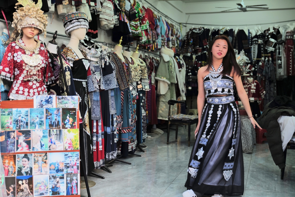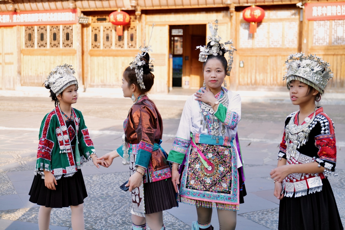 圖為肇興侗寨街頭著民族服飾盛裝的姑娘。