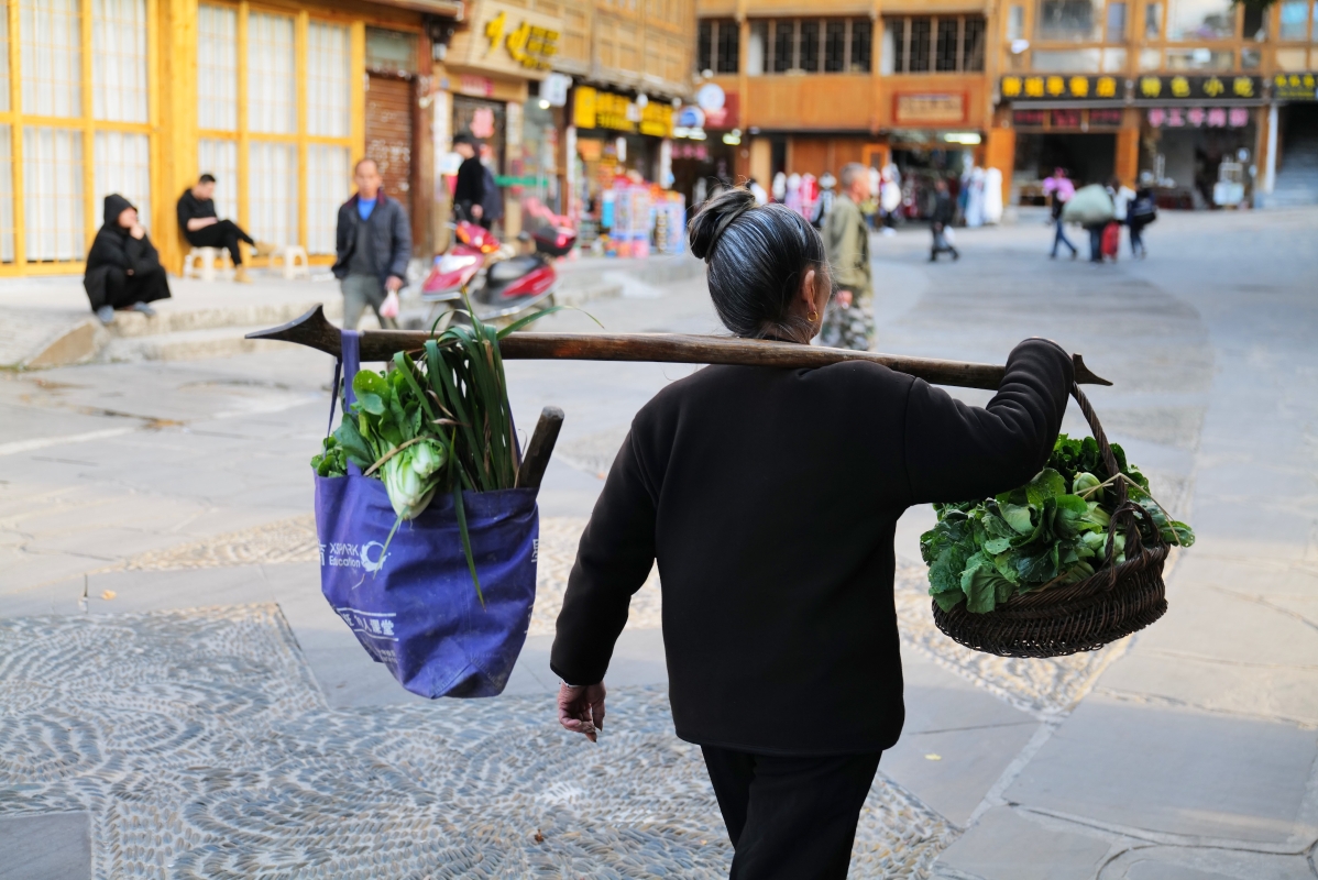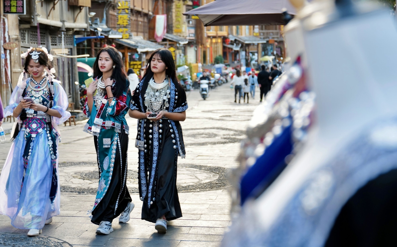 圖為盛裝的姑娘在肇興侗寨大街上。