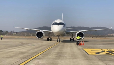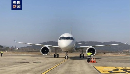 全球首架C919國產大飛機飛抵青島膠東國際機場。中新網圖 當天印有“全球首架”“中國印”標識和專屬“身份證號”塗裝的東航國產C919飛機,飛抵青島膠東國際機場,為C919飛機100小時驗證飛行再添新航點。 2022年12月初,東航接收全球首架C919。當月下旬,東航C919飛機開始進行100小時驗證飛行,全面檢驗東航各系統迎接、準備C919商業運行各項工作的保障能力。 目前,100小時驗證飛行計劃有新調整,涉及的起降機場從此前的11個增至14個。C919飛機在飛抵青島之前,已在上海、北京、成都、西安、海口等5個城市、6座機場密集開展驗證飛行,後續還將繼續前往濟南、南昌、武漢、合肥、南京、太原等航點開展驗證飛行。 據悉,東航為全球首架C919配備兩艙佈局,164座,包括8個公務艙和156個經濟艙。在C919完成航線驗證飛行後,東航爭取在2023年春將C919正式投入商業載客運營。屆時,C919將出現在青島、上海、北京、西安、昆明、廣州、成都、深圳等航線上。 另外,截至2022年底,C919累計獲得32家客戶1035架訂單。(完) 【編輯:凌玉辉】