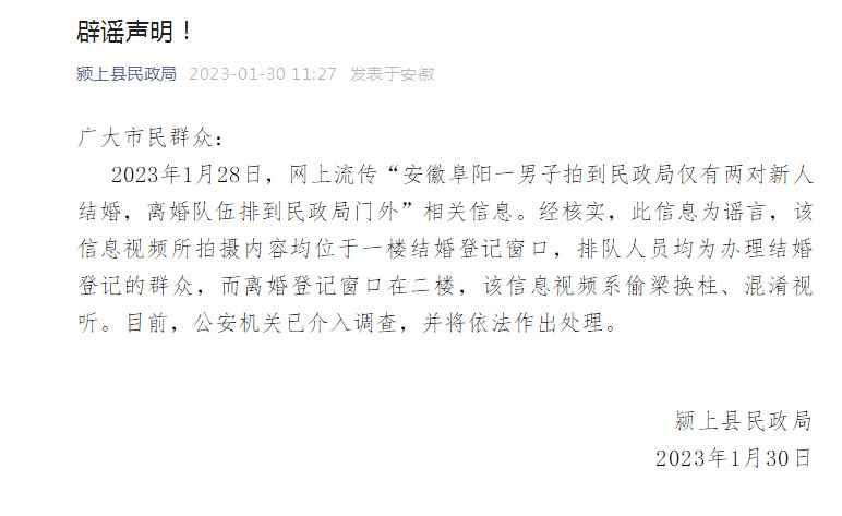 香港中通社1月30日電 30日,中國安徽潁上縣民政局官方微信公眾號發布闢謠聲明,稱28日網上流傳的“安徽阜陽一男子拍到民政局僅有兩對新人結婚,離婚隊伍排到民政局門外”相關信息係謠言。