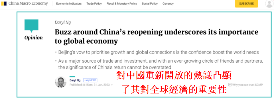 香港《南華早報》報道截圖 1月中旬,中國副總理劉鶴時隔五年再度出席達沃斯世界經濟論壇,其對於中國經濟增長的保證激發了人們對世界經濟前景的樂觀情緒。國際貨幣基金組織也上調了對2023年全球經濟表現的預測。 投資者們已經注意到了這一點,尤其是香港的投資者。數據顯示,在虎年最後一個交易日,恒生指數大漲393點,收報22044.65點,創下了自2022年6月28日以來的收市新高。 來自美國私募股權基金公司“黑石集團”的副董事長拜倫·韋恩預測,2023年將出現10個“驚喜”,其中包括“中國將實現5.5%的增長目標,并積極與西方重新建立牢固的貿易關係,這對其實物資產和商品都有積極的影響”。 數據顯示,中國是140多個國家和地區的主要貿易夥伴,2022年中國貨物貿易總額同比增長了7.7%,連續六年位居世界第一。