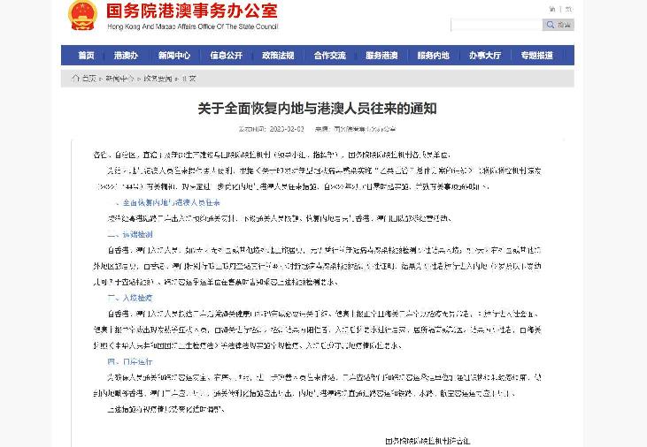 香港新聞網2月3日電 據國務院港澳事務辦公室消息,為給內地與港澳人員往來提供更大便利,自2023年2月6日零時起進一步優化內地與港澳人員往來措施。