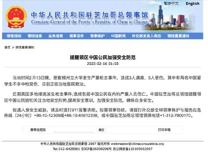 中領館:2名中國留學生在密歇根州立大學槍擊事件中受傷分享到: