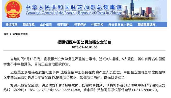 2月13日,在位於美國密歇根州東蘭辛的密歇根州立大學,警察查看槍擊事件現場。新華社/美聯 有媒體向中國駐芝加哥總領館提問:2月13日晚,密歇根州立大學發生嚴重槍擊事件,造成3人遇難、5人受傷。請問傷亡人員中是否有中國留學生?總領館對此有何回應? 總領館發言人表示,發生在密歇根州立大學的嚴重槍擊事件令人震驚,中國駐芝加哥總領館對兇犯濫殺無辜的殘忍犯罪行徑表示強烈憤慨和嚴厲譴責。槍擊事件發生後,總領館高度重視,立即啟動應急機制,第一時間聯繫當地警方、密歇根州立大學校方和中國學聯會以及當地僑社等多方了解案情及涉中國留學生傷亡情況。經與當地警方核實,槍擊事件遇難人員中無中國留學生,有兩名中國留學生在事件中不幸中槍受傷,在醫院接受手術治療後已脫離生命危險,醫院正進一步評估下步治療方案。我們衷心希望有關受傷同學能早日康復。 總領館已與受傷中國留學生家屬取得聯繫,向家屬表示慰問,並為家屬來美提供必要協助。總領館與校方保持密切聯繫,推動其協助做好家屬來美相關保障事宜。槍擊事件發生後,總領館與該校中國學聯會保持密切溝通,學聯會已及時發佈安全通報,提醒該校中國留學生加強自我安全防範,如有需要第一時間聯繫警方或總領館尋求協助。 總領館敦促美有關方面採取切實有效措施,保障在美正常旅居工作生活的包括留學生在內的廣大中國公民的安全和合法權益。 總領館在此提醒領區包括中國留學生在內的廣大中國公民密切關注當地治安狀況,進一步提高風險意識,加強安全防範與自我防護,確保自身安全。如遇安全威脅,請立即撥打美國報警求助電話,並聯繫總領館尋求領事協助。 總領館將繼續密切跟蹤此案後續進展,做好相關領事保護與協助工作。 【編輯:馬華】