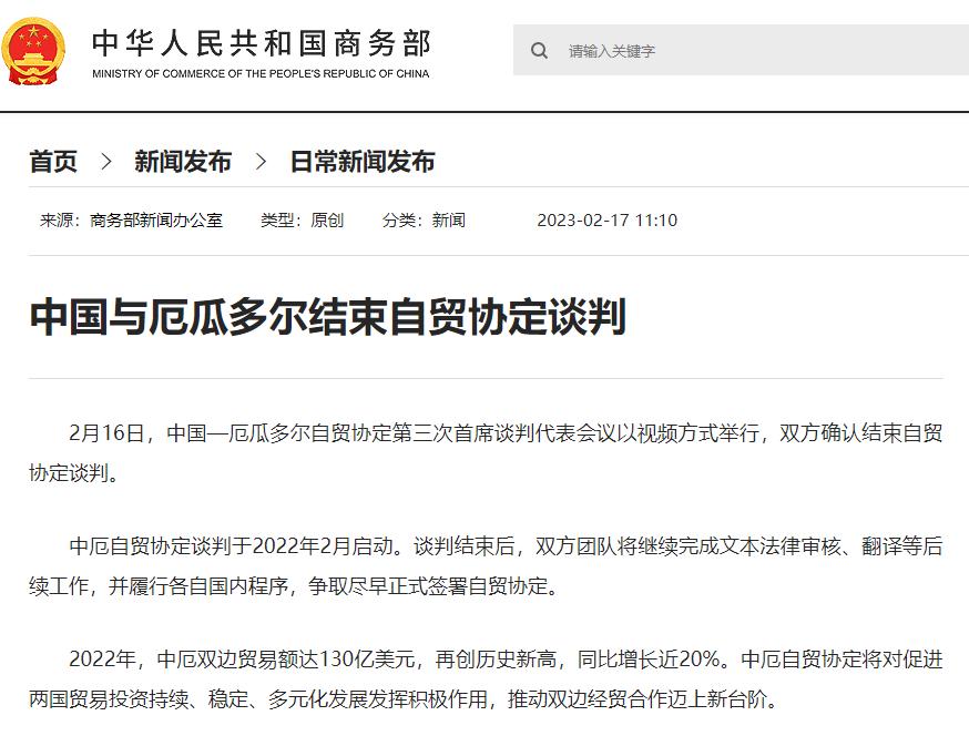 香港新聞網2月17日電 據中國商務部網站消息,2月16日,中國—厄瓜多爾自貿協定第三次首席談判代表會議以視頻方式舉行,雙方確認結束自貿協定談判。 中厄自貿協定談判於2022年2月啟動。談判結束後,雙方團隊將繼續完成文本法律審核、翻譯等後續工作,並履行各自國內程序,爭取盡早正式簽署自貿協定。 2022年,中厄雙邊貿易額達130億美元,再創歷史新高,同比增長近20%。中厄自貿協定將對促進兩國貿易投資持續、穩定、多元化發展發揮積極作用,推動雙邊經貿合作邁上新台階。