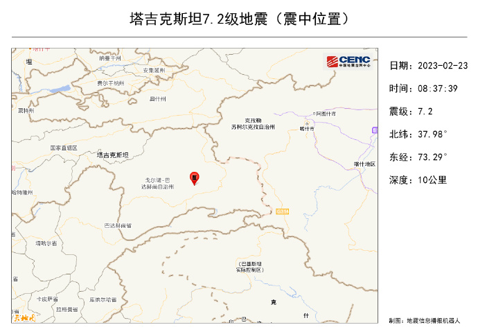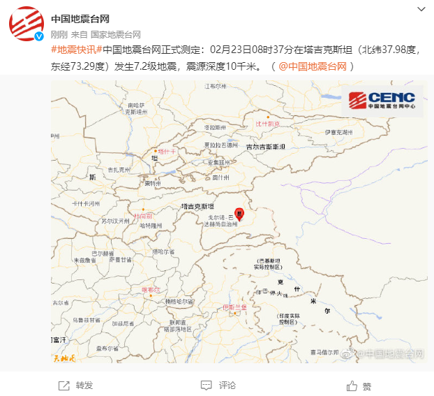 香港新聞網2月23日電 據@中國地震台網 消息,中國地震台網正式測定:02月23日08時37分在塔吉克斯坦(北緯37.98度,東經73.29度)發生7.2級地震,震源深度10千米。