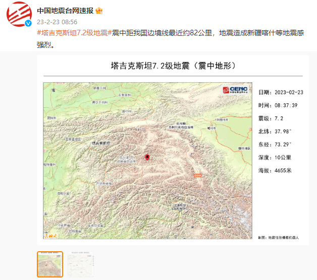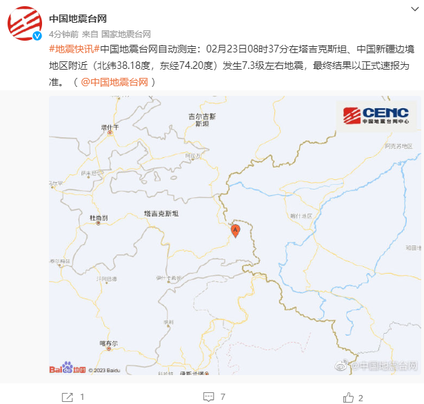 稍早前,中國地震台網自動測定:02月23日08時37分在塔吉克斯坦、中國新疆邊境地區附近(北緯38.18度,東經74.20度)發生7.3級左右地震,最終結果以正式速報為準。