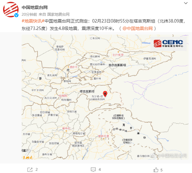 此外,中國地震台網發佈,塔吉克斯坦8時55分和8時57分分別發生地震。 中國地震台網正式測定:02月23日08時55分在塔吉克斯坦(北緯38.09度,東經73.25度)發生4.8級地震,震源深度10千米。
